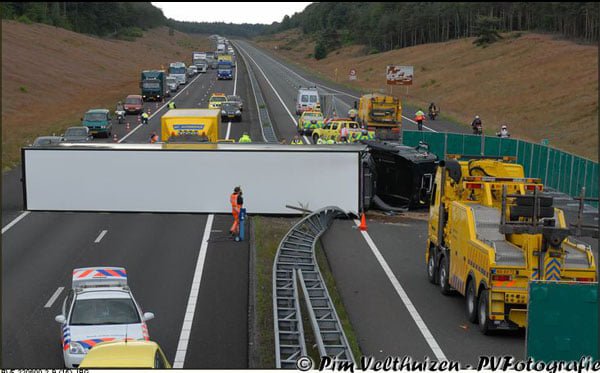 HOENDERLOO – Op de snelweg A1 tussen Kootwijk en Hoenderloo is maandagmiddag een vrachtwagen tegen de middenvangrail gebotst en vervolgens gekanteld. Drie mannen zouden daarbij gewond zijn geraakt.