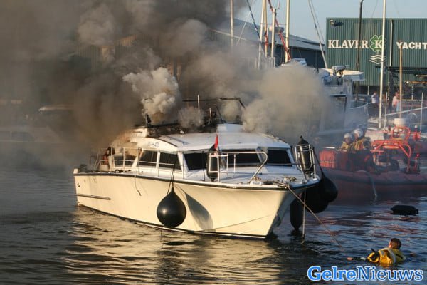 De motorboot is totaal uitgebrand. De man die op het schip werkte, raakte gewond en is naar het ziekenhuis overgebracht.