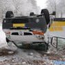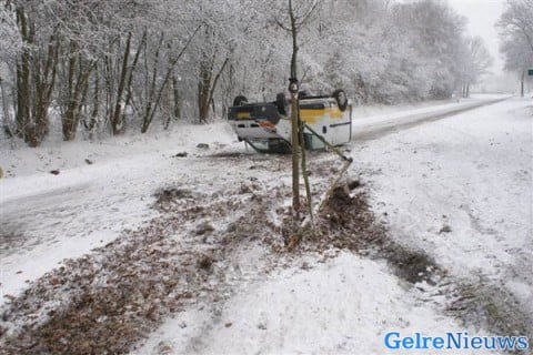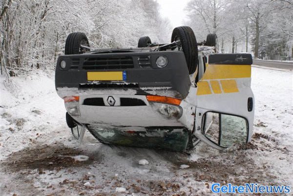 Bedrijfsbusje over de kop door gladheid