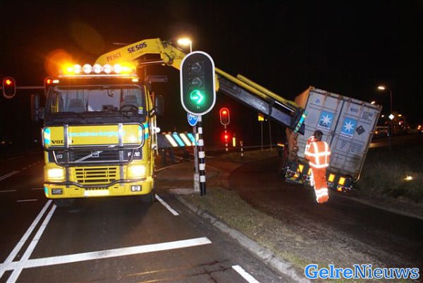De politie kreeg omstreeks 00.40 uur melding van het ongeval. De 64-jarige man raakte met zijn vrachtwagen in de sloot. Een blaastest ter plaatse wees uit dat de man onder invloed van alcohol was. Hierop is de man aangehouden en overgebracht naar het politiebureau. Doordat de man lichamelijk niet in staat was een goede ademanalyse af te leveren, is er een bloedproef afgenomen om vast te stellen hoeveel de man gedronken heeft. De uitslag daarvan is over enkele dagen bekend. De man is heengezonden met een rijverbod en een proces-verbaal.