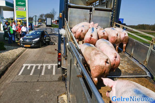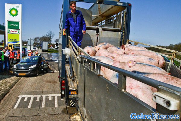 LAREN (G) – Voor ruim 200 varkens werd de slacht donderdagmiddag even uitgesteld. De vrachtwagen waarin de dieren werden vervoerd raakte betrokken bij een aanrijding op de Rengersweg N332 tussen Laren(G) en Lochem.