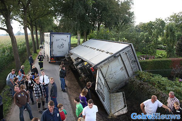 PUTTEN – Op woensdag 8 september is op de Hooiweg in Putten een aanhanger van een vrachtwagen gekanteld en in de naast gelegen sloot beland. De aanhanger was beladen met 121 kalveren waarvan er drie het incident niet overleefd hebben.