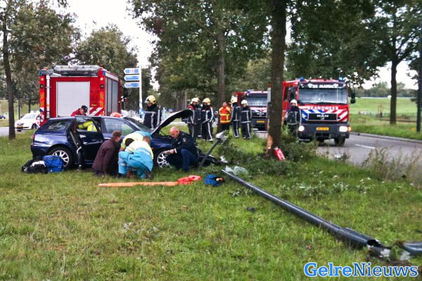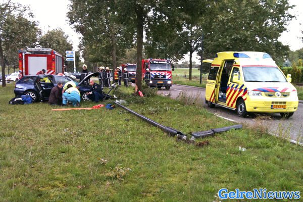 Volgens de politie reed de 21-jarige Apeldoornse bestuurder rond kwart voor twee in de richting van Beekbergen toen hij door een onbekende oorzaak tegen een lantaarnpaal in de berm botste. De auto kwam tegen een boom tot stilstand. Hulpdiensten kwamen ter plaatse. De 21-jarige bestuurder raakte net als zijn 22 jarige bijrijder gewond. Beiden werden per ambulance naar het ziekenhuis overgebracht. Een derde inzittende, een 21-jarige man, kwam met de schrik vrij.