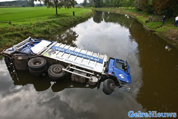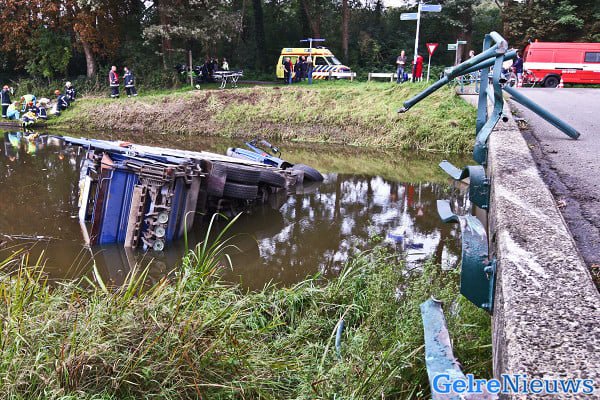 Vuilniswagen rijdt van brug in Almen