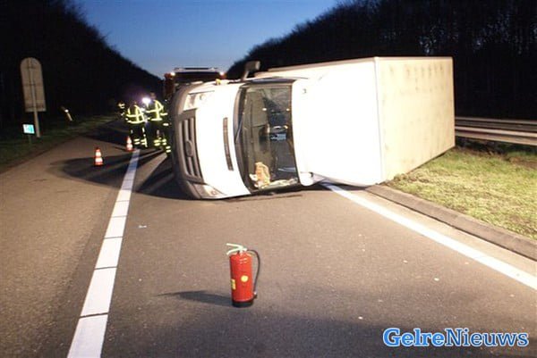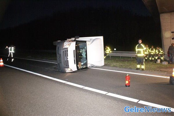 Het ongeval gebeurde rond half negen. Hulpdiensten rukte in grote getallen uit. Ter plaatse bleek dat een bestelbus/vrachtwagentje was gekanteld in de middenberm. De snelweg werd tijdelijk afgestolen. De bestuurster en haar zoontje werden door het ambulancepersoneel gecontroleerd. Ze liepen geen verwondingen op. Ook hun hond kwam met de schrik vrij. Het verkeer werd over de vluchtstrook geleid.