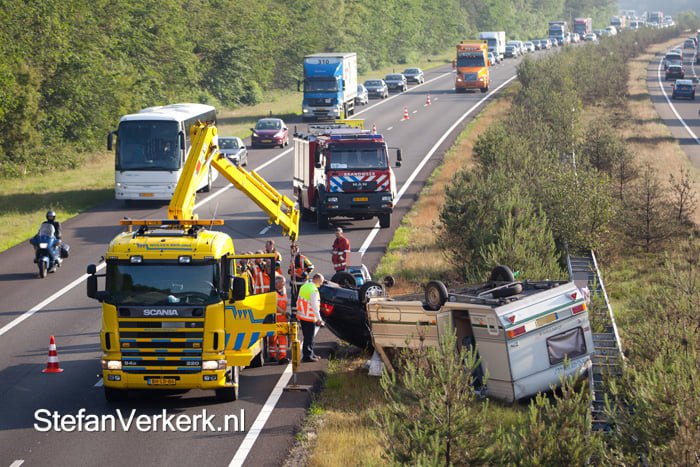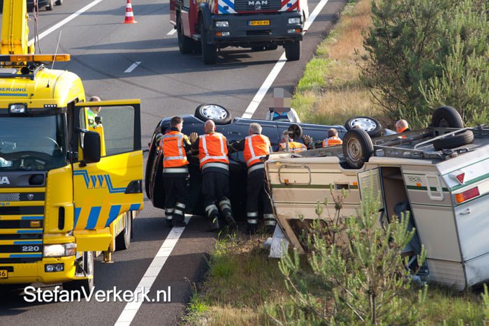 WEZEP – De bestuurder en bijrijder van een auto met een caravan zijn woensdagochtend door de oog van de naald gekropen bij een eenzijdig verkeersongeval op de A50 tussen afslag Hattem/Wezep en Heerde. De auto sloeg samen met de caravan over de kop.