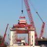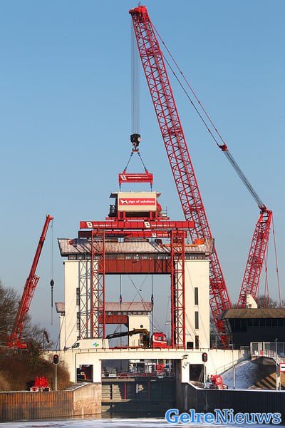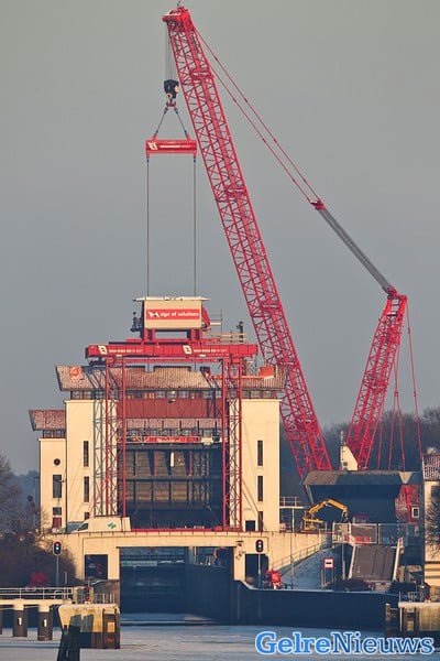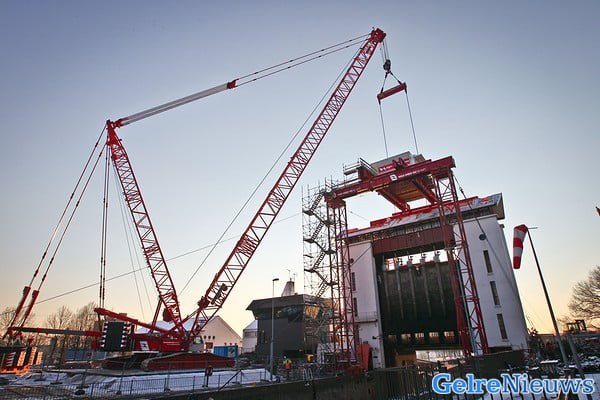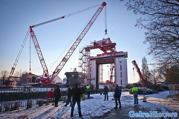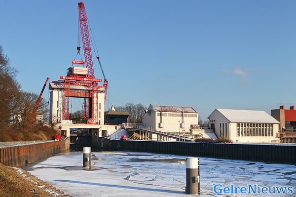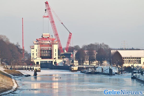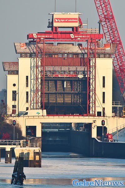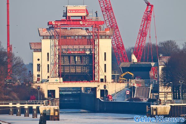 Rijkswaterstaat is klaar met het bouwen van een tijdelijke hefconstructie die de kapotte sluisdeur op en neer moet takelen. Er is een vijftig meter hoge kraan neergezet die de negentig ton wegende sluisdeur moet ophijsen. Ook is er een ombouw rond de sluis gemaakt die ervoor moet zorgen dat de sluisdeur gezekerd wordt zodra er een schip onderdoor vaart. De tijdelijke hefconstructie wordt dit weekend uitgebreid getest en Rijkswaterstaat neemt verder geen enkel risico met de noodvoorziening. Zo worden er maar liefst vier ‘sluismeesters’ (normaal één) ingezet om het schutten in goede banen te leiden. ,,Alles moet zeer goed op elkaar worden afgestemd”, zegt een woordvoerder van Rijkswaterstaat. ,,Het protocol is hiervoor aangepast. Dit weekend wordt getest of het aangepaste protocol voldoet. We verwachten in de loop van maandag de eerste van de 42 schepen die nu op het Twentekanaal liggen te kunnen schutten.”