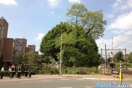 De boom staat op de hoek van de Bruglaan met de President Kennedylaan en heeft meerdere stammen. De stam die op de bovenleiding van het spoor dreigde te vallen, is door de brandweer in stukken gezaagd. De rest staat nu stabiel.