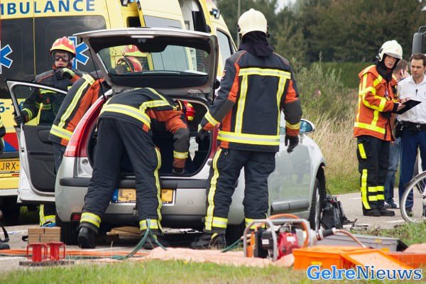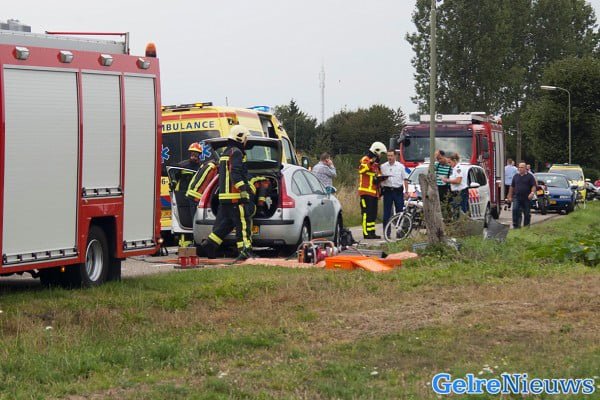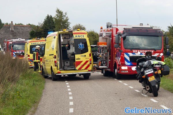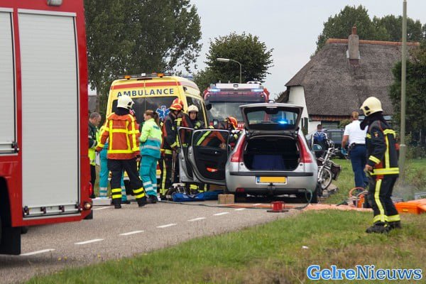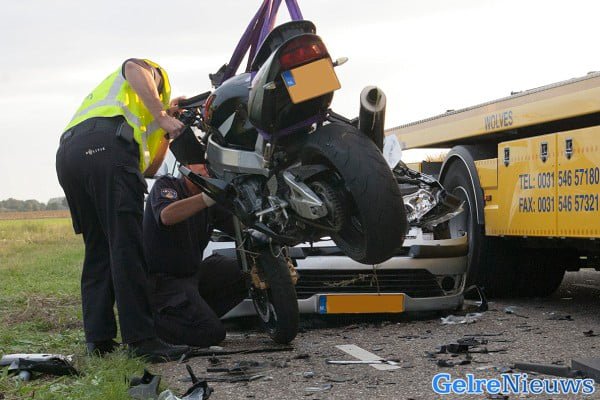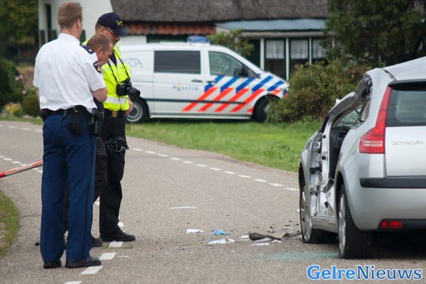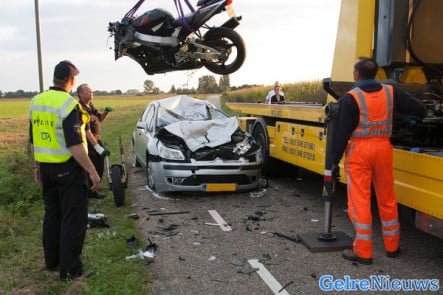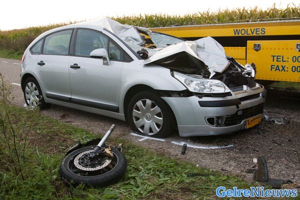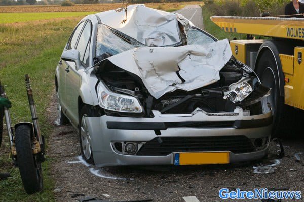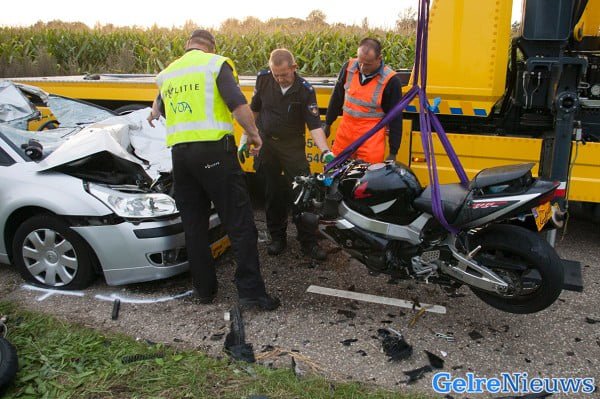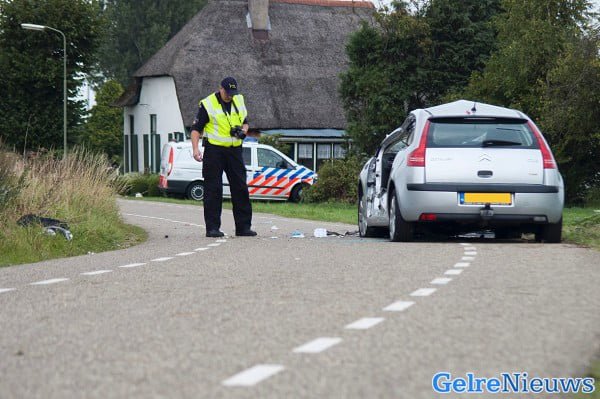 Het ongeluk gebeurde rond 16.35 uur. De motorrijder en auto kwamen frontaal met elkaar in botsing. De motor kwam in een naastgelegen maïsveld terecht; de motorrijder belandde op de voorruit van de auto. Hij is met een traumahelikopter naar het ziekenhuis in Nijmegen gebracht. De automobilist, een 71-jarige man uit Groenlo, raakte eveneens gewond. Hij is door de brandweer uit zijn auto gehaald en met onbekend letsel per ambulance overgebracht naar het ziekenhuis in Zutphen. Zijn echtgenote moest voor controle naar het ziekenhuis.