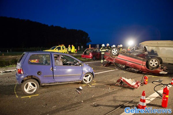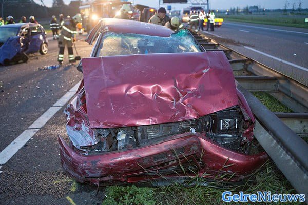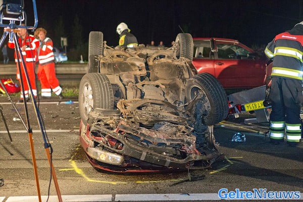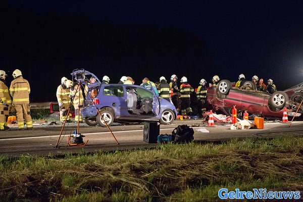De brandweer heeft vier slachtoffers met hydraulisch redgereedschap moeten bevrijden uit hun auto, omdat zij bekneld zaten in het wrak.