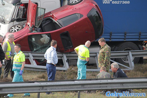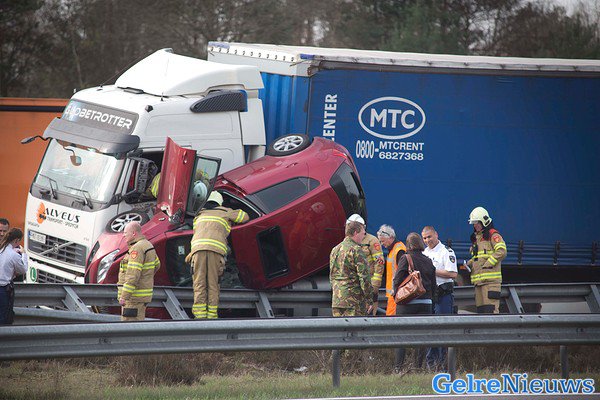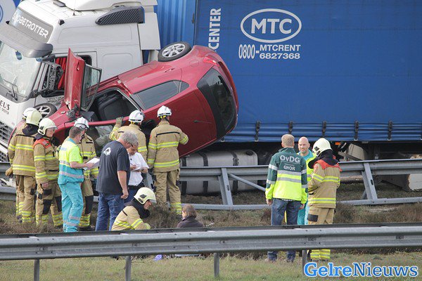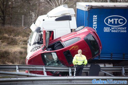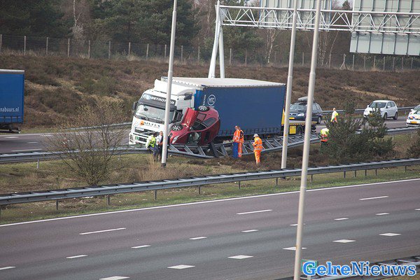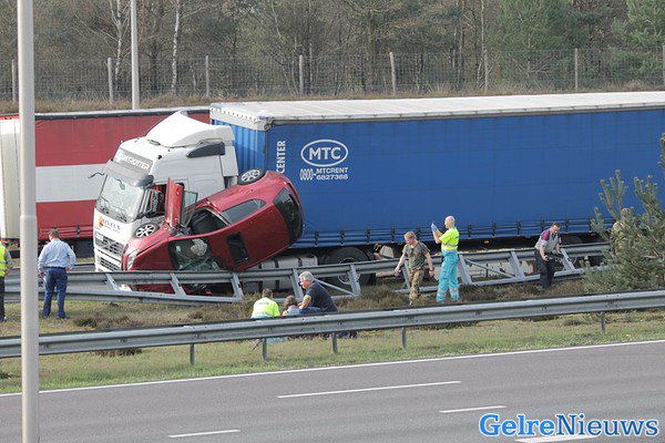 HOENDERLOO – Een automobiliste mag zeggen dat ze maandag einde van de middag een engel heeft gehad op haar schouder. De auto kwam op z’n kant tussen een vrachtwagen en de vangrail terecht.