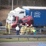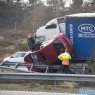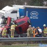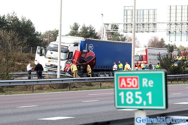 Auto tussen vrachtwagen en vangrail op A50