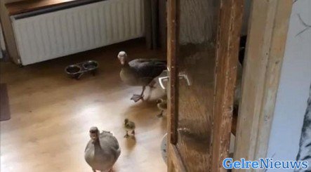 Via de achterdeur kwam ineens vier volwassen ganzen naar binnen samen met maar liefst 11 kuikens. De ganzenfamilie waggelde rustig door het huis en maakten een rondje waarna ze weer naar buiten gingen.