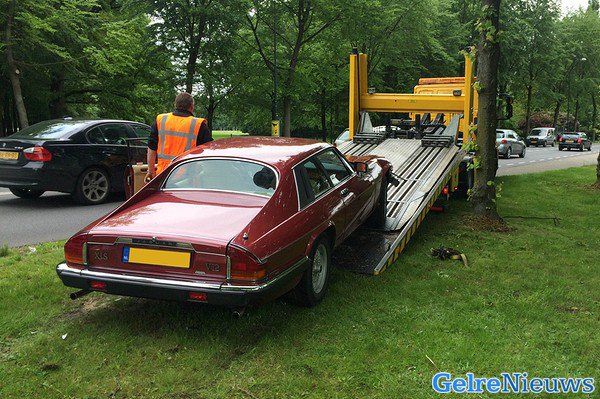 De bestuurder kwam met de schrik vrij. Zijn Jaguar uit 1990 bracht het er minder goed vanaf. De wagen moest worden afgesleept.