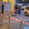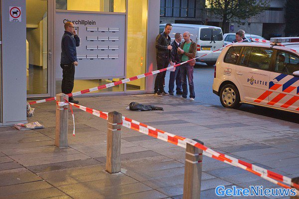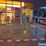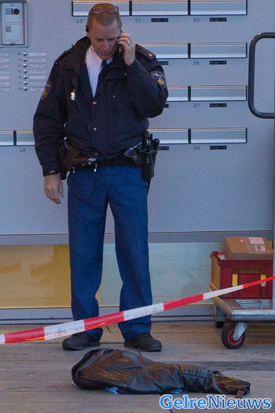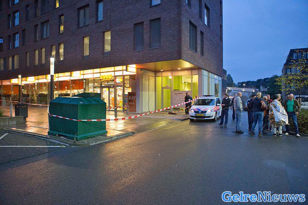 Voor de ingang van de winkel ligt een jas op de grond. Mogelijk is die van één van de overvallers. De politie is een groot onderzoek gestart.