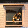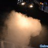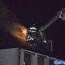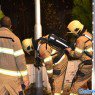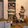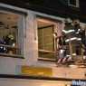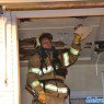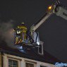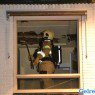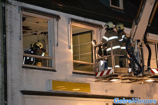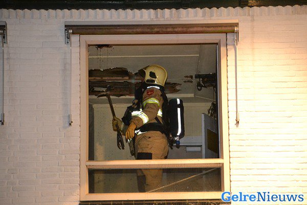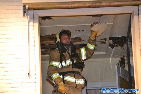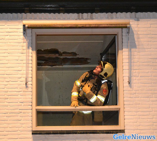 Het plafond werd opengebroken om de brand definitief te kunnen bestrijden. Na afloop werd de brand nog even geëvalueerd door de brandweerlieden.