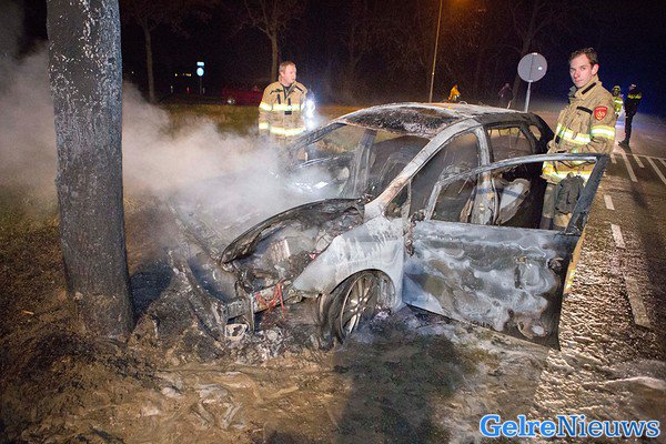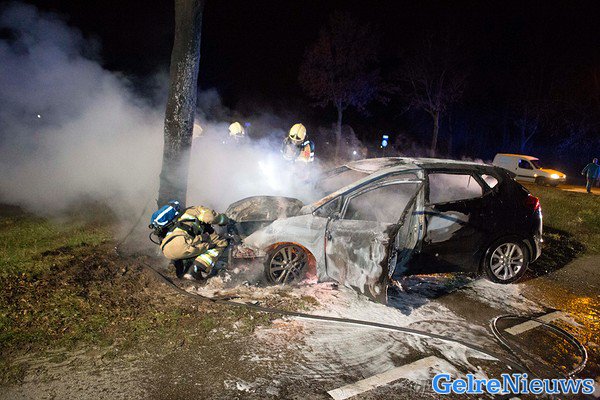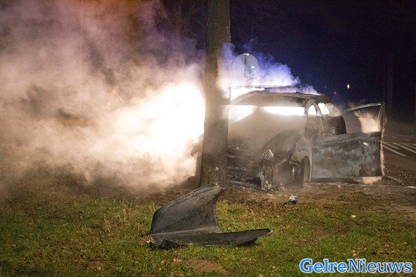 Het ongeluk gebeurde rond 18.45 uur op de Ganzepoelweg. Door nog onbekende oorzaak raakte de bestuurder van de auto de macht over het stuur kwijt en kwam tegen een boom langs de weg tot stilstand. Door de klap is de auto in brand gevolgen, aldus de politie. Toen de brandweer aankwam stond de auto al geheel in lichterlaaie.