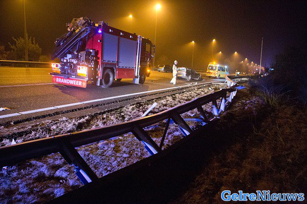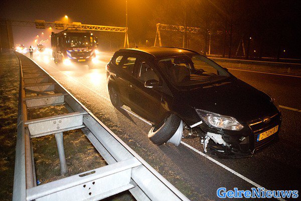 Bij Terlet verloor door nog onbekende oorzaak een automobilist een wiel. Een andere bestuurder, die achter hem reed was met zijn wagen in volle vaart over het wiel gereden. Hij klapte tegen de vangrail en schoot door. De auto met drie wielen kwam een paar honderd meter verder tot stilstand. In die auto zat ook een kind, zij heeft een traumabeertje gekregen voor de schrik.