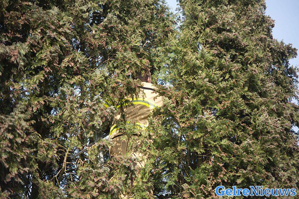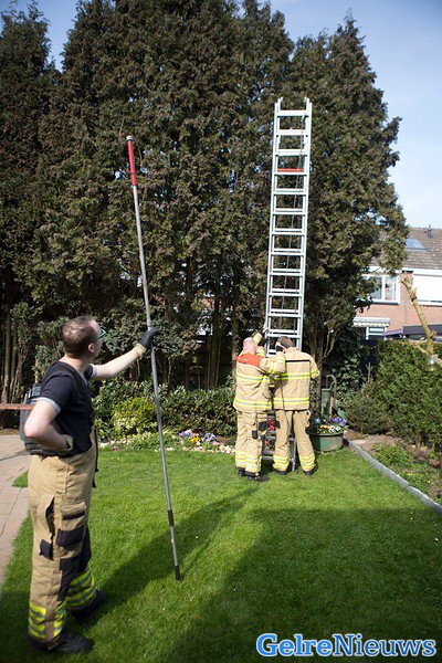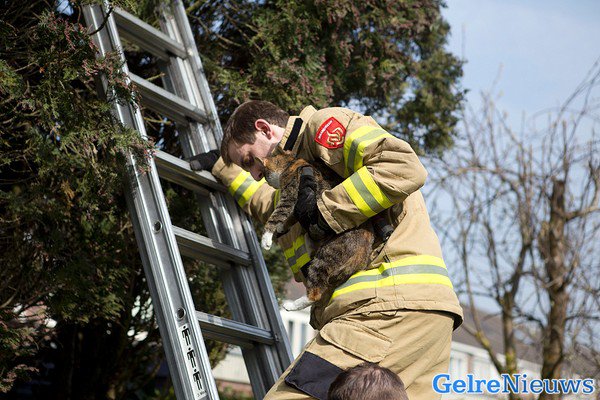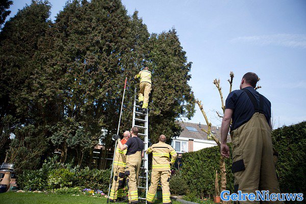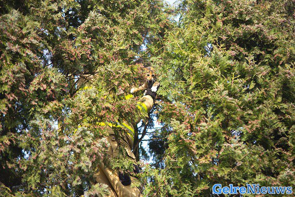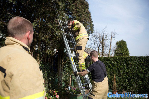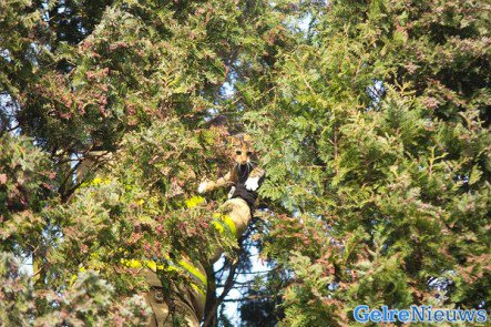 Nadat de kat na een aantal uur nog steeds niet uit de 5 meter hoge coniferenboom kwam, heeft de eigenaar de brandweer gebeld. Die hebben in een korte tijd -met behulp van een lader tegen de boom aan- weten Shifa te redden. Het gaat na omstandigheden goed met haar. Ze heeft geen verwondingen aan het avontuur overgehouden.