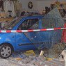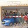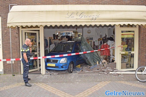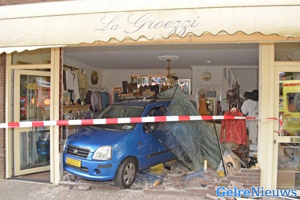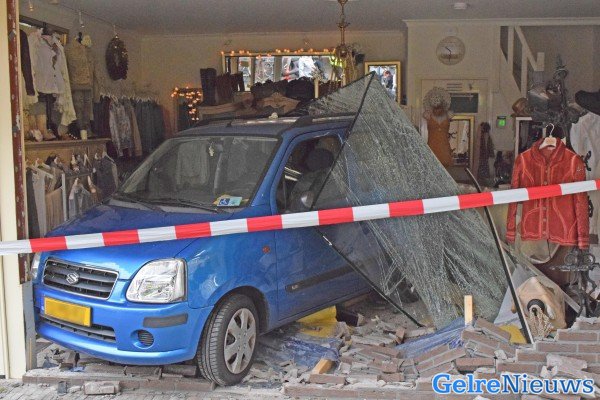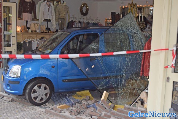 De onfortuinlijke automobilist trapte het verkeerde pedaal in en reed achteruit de kledingwinkel binnen. Gelukkig raakte niemand gewond bij het ongeval. De schade aan het winkelpand is groot. De gehele pui ligt er uit.