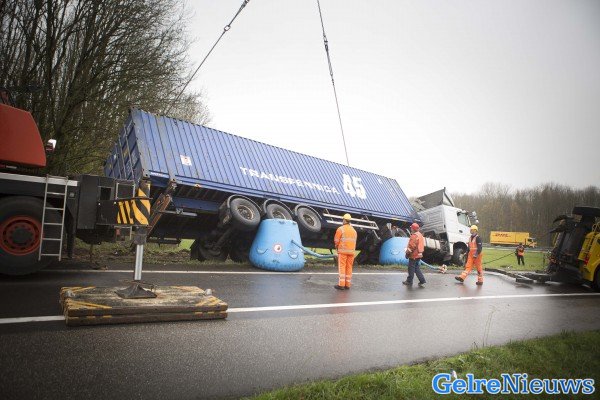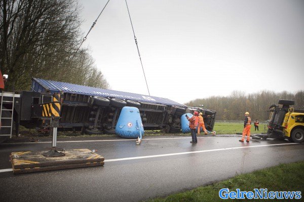Vrachtwagen kantelt in bocht A15 naar A325 bij Ressen