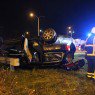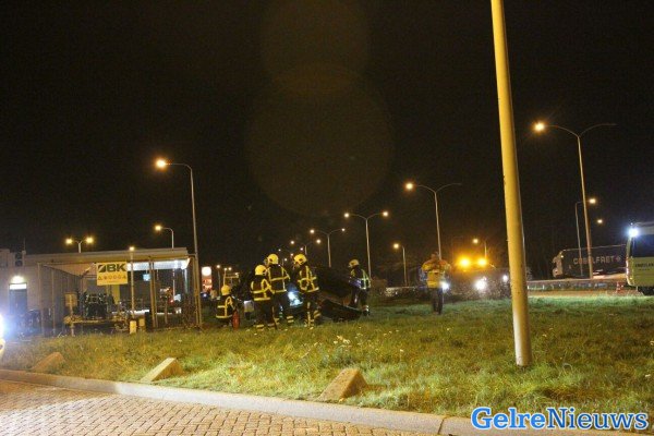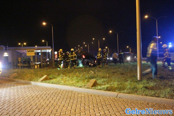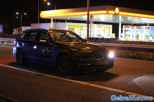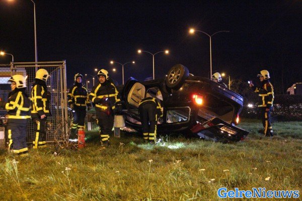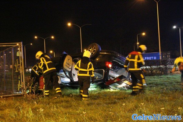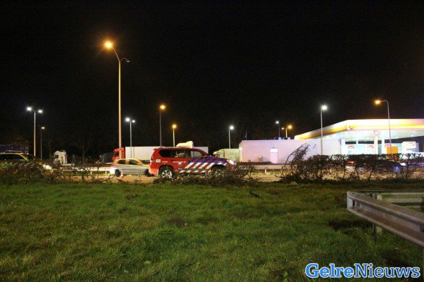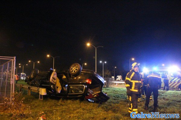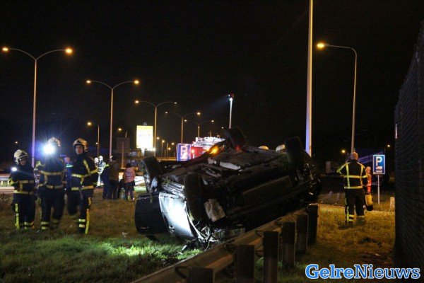 Het gebeurde even na 20.00 uur toen door nog onbekende oorzaak twee auto’s met elkaar in botsing kwamen. Eén van de auto’s sloeg over de kop en eindigde op het gras langs de parkeerplaats bij het Shell-station aan de snelweg.