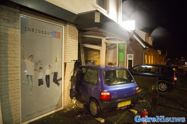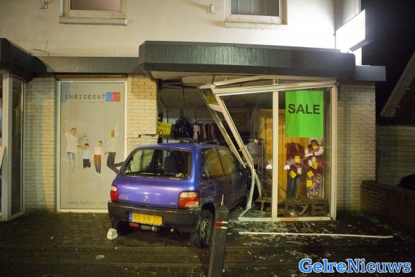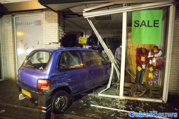 Dronken vrouw rijdt met auto kledingzaak binnen
