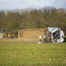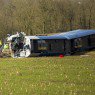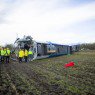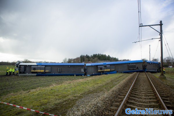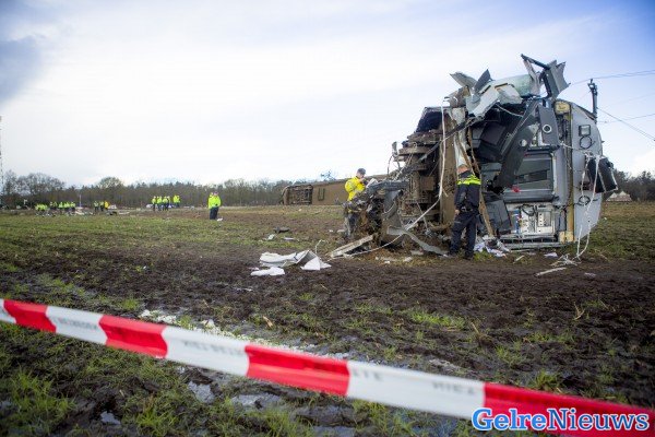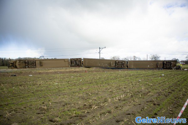 De 3 trein delen liggen in het weiland naast het spoor. De politie doet veder onderzoek. Het trein verkeer ligt stil tot dat de trein geborgen is.