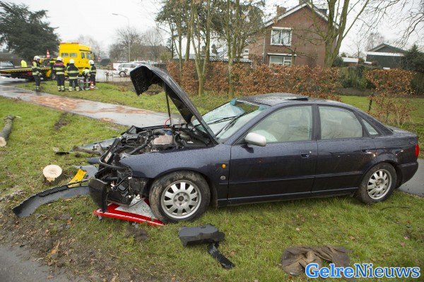 De bestuurder is gewond per ambulance naar het ziekenhuis gebracht. Over zijn verwondingen is niks bekend. De brandweer heeft de boom tot de grond gelijk gezaagd. De verkeersborden en de rioleringskast zullen vervangen moeten worden.