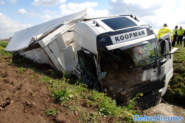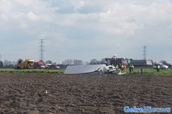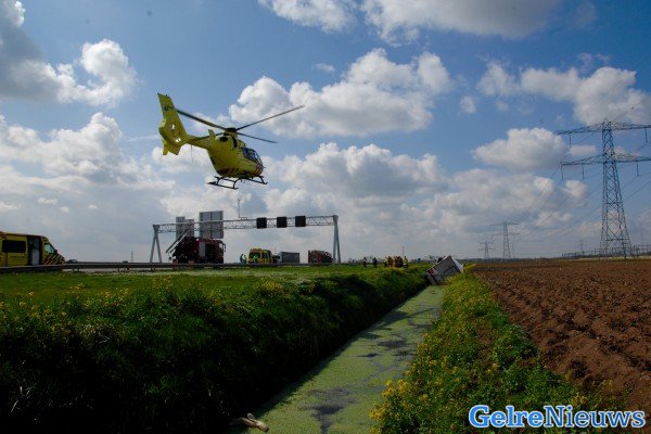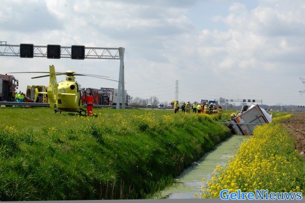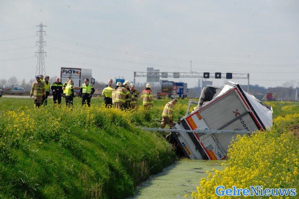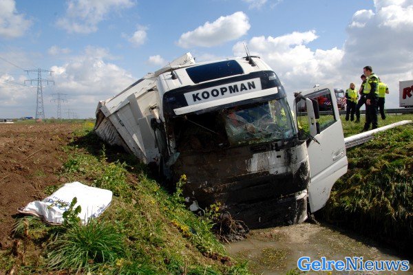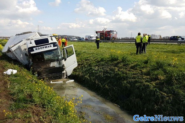 Door nog onbekende reden kwam de vrachtwagen in de berm terecht en belandde uiteindelijk in een sloot naast de snelweg, volgens een weginspecteur van Rijkswaterstaat is de vrachtwagenchauffeur mogelijk onwel geworden. De vrachtwagen, geladen met zakken proteïne concentraat voor zuivelproducten, is een paar honderd meter door de berm gereden waarna hij op zijn kant in de sloot is beland. De opgeroepen traumahelikopter is in de berm geland. De massaal gealarmeerde hulpdiensten konden de chauffeur vrij gemakkelijk uit zijn cabine halen. Hij is vervoerd naar een ziekenhuis.