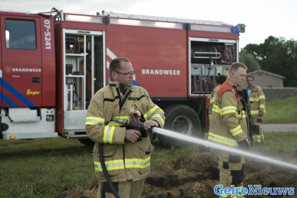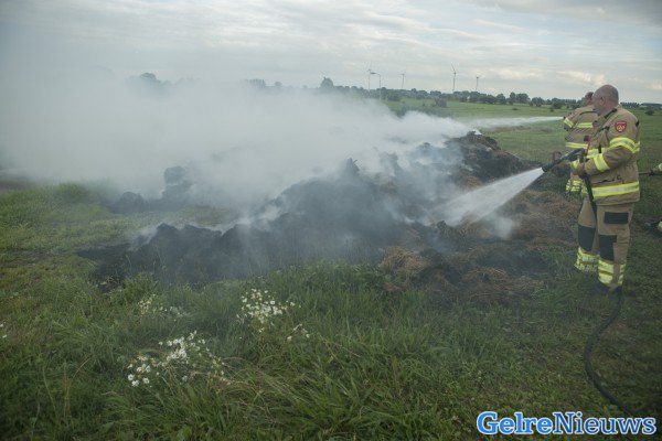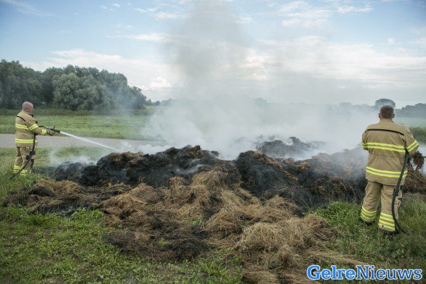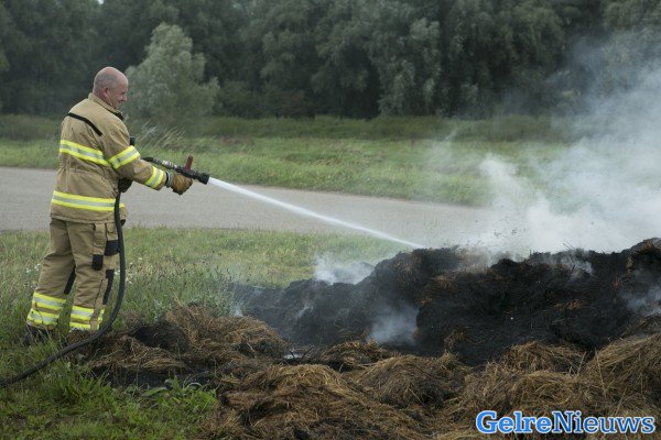 De brandweer was enige tijd bezig met het vuur te blussen. De berg hooi lag daar nadat er langs de weg was gemaaid.