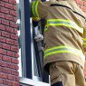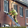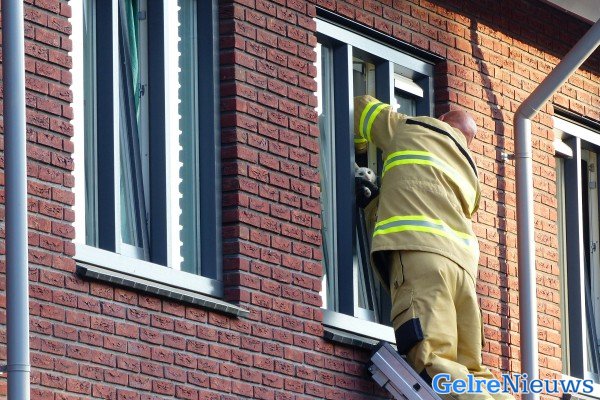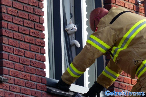 Gelukkig waren daar attente buren die het doordringende gemiauw van de kat hoorden en zij waarschuwden de brandweer, die met vereende krachten ter plaatse kwamen. Na de situatie en gevarenzetting te hebben beoordeeld, klom één van de dappere hulpverleners de ladder op en bevrijdde het beestje uit zijn benarde positie.