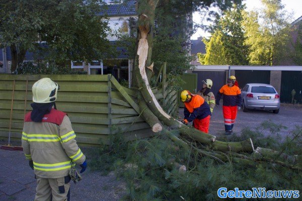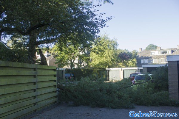 De personenauto heeft door de takken iets schade aan de zijkant opgelopen. De schutting is voor een deel kapot, dat moet vernieuwd worden.