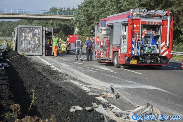 Vrachtwagen met vijverslib kantelt op A50 bij Hoenderloo