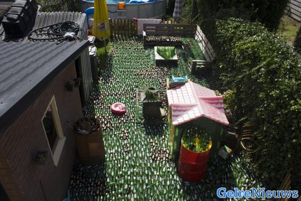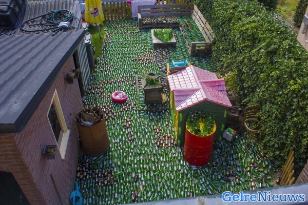 De vriendengroep van Wouter en Michelle heeft bij een eerder huwelijk van één van de vrienden een grote boog voor hun huis van kratten bier gemaakt. ‘Maar dat kun je geen tweede keer doen’ aldus Miel, dus ze moesten met iets nieuws aankomen. Daarop werd het idee geboren om de hele tuin vol te leggen met lege flesjes bier.