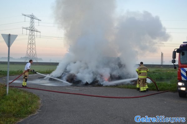 Een oplettende voorbijganger zag op de A15 bij Bemmel een grote rookpluim en daarna ook vlammen die uit de richting van Angeren kwamen. Hierop is hij poolshoogte gaan nemen en heeft de brandweer gebeld. Het bleek te gaan om een grote stapel geperste hooi balen die vermoedelijk al uren aan het branden was, aldus de brandweer.