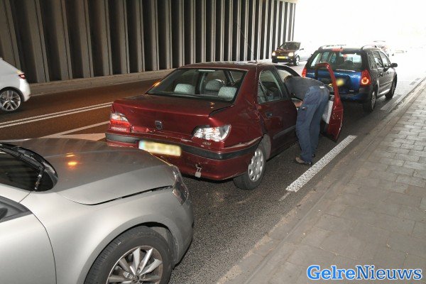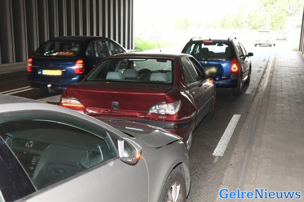 DUIVEN – Op de Rivierweg in de tunnel onder de A12 in de richting van Westervoort is er een kop-staart aanrijding gebeurd tussen vier personenauto’s.