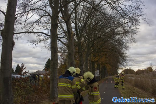 Brandweer verwijderd instabiele boom naast fietspad in Spankeren