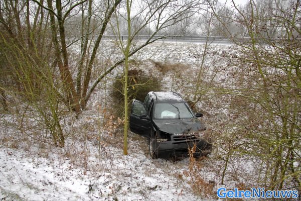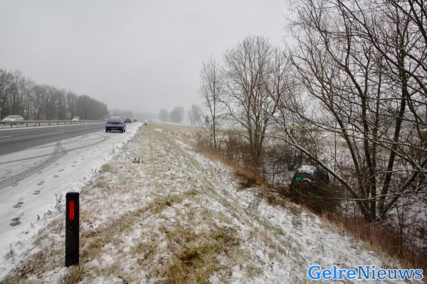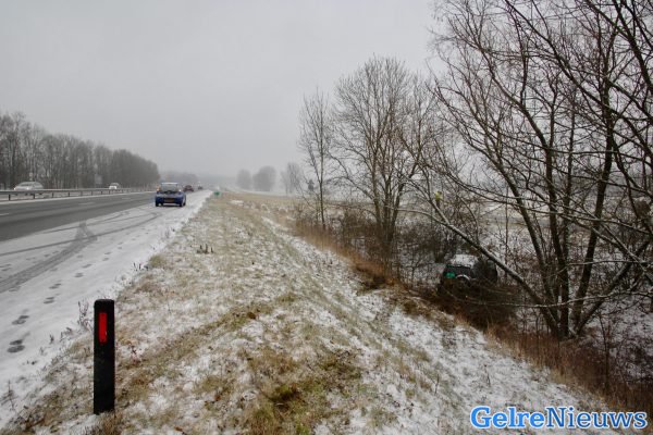 Net voorbij de afslag Rheden raakte een Landrover in de slip en kwam 5 meter lager onder aan het talud terecht. De inzittenden konden zonder verwondingen uit de auto stappen. Dit ondanks dat de auto in zijn slippartij ook nog een boom had mee genomen.