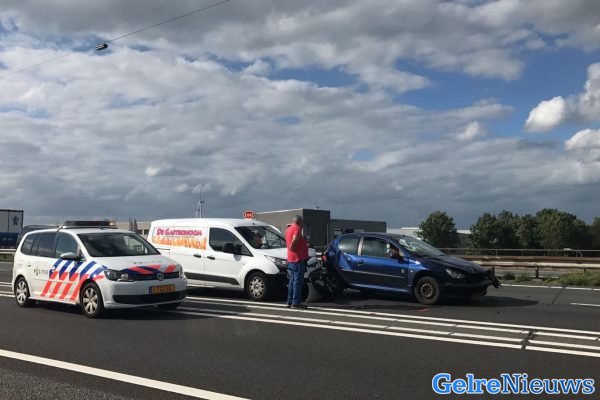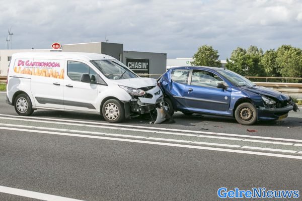 Ter hoogte van Duiven botste één auto tegen een vrachtwagen aan waarna de bestelbus weer achterop de personenauto botste.