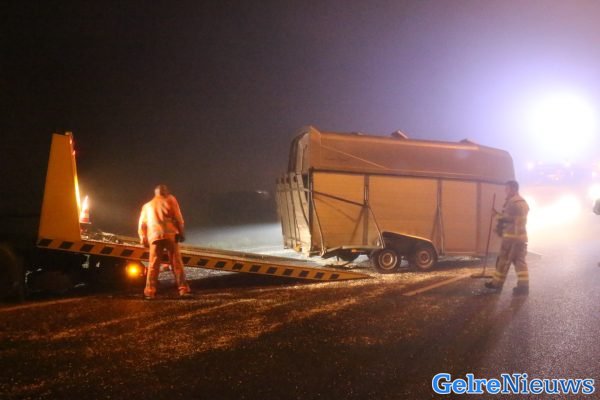 Rond 00:30 uur kwam er een melding binnen dat er een ongeval plaats had gevonden tussen twee auto’s, waarvan één met een paardentrailer. Door nog onbekende oorzaak kwamen beide voertuigen met elkaar in botsing waarna de auto met paardentrailer kantelde. De trailer brak van het voertuig af en raakte zwaar beschadigd.