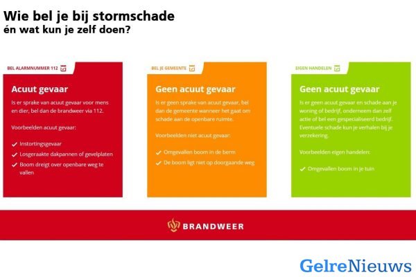 Lees in onderstaande afbeelding van de brandweer wie je wanneer belt bij stormschades. Ook lees je hierin wat je zelf kunt doen.
