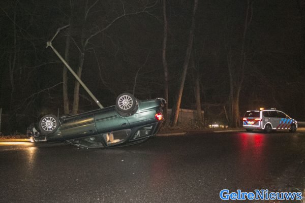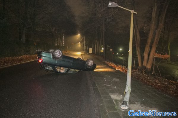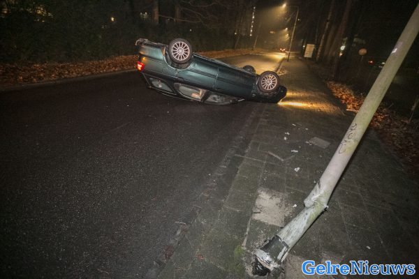 Het gebeurde rond 6.30 uur. De vrouw schoot met haar auto uit de bocht, reed de stoep op en ramde vervolgens een lantaarnpaal. Ze kwam op haar kop tot stilstand.