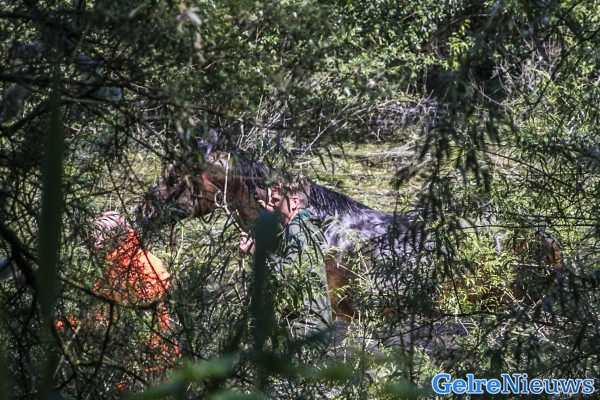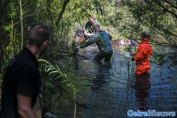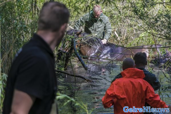 Paard schrikt, raakt te water en zit vast in bodem