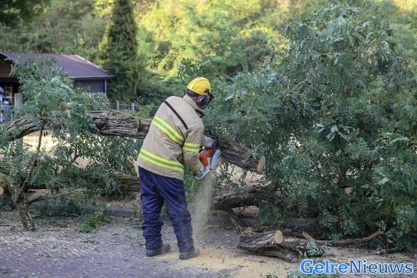 De brandweer heeft de boom in stukken gezaagd. De restanten van de boom worden later door de gemeente opgehaald.