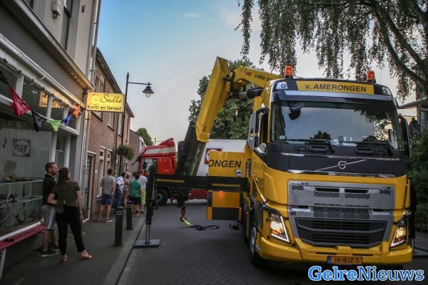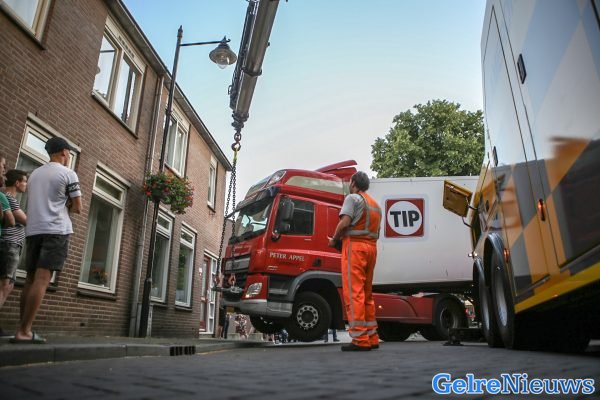 Van Amerongen heeft met behulp van een grote kraan de vrachtwagen opgetild en een stuk verplaatst zodat hij weer weg kon rijden uit zijn benarde situatie.