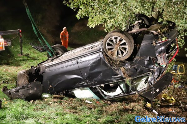 Een berger gaat het autowrak wegslepen. De politie doet verder onderzoek.