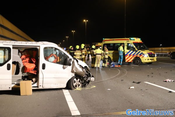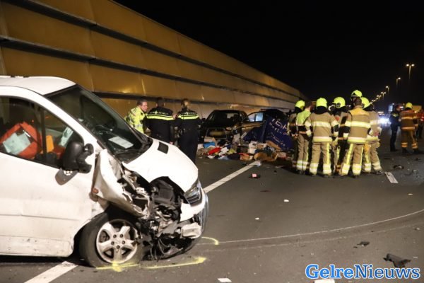 Er heeft een botsing plaatsgevonden tussen een auto met aanhanger, een bestelbusje en twee personenauto’ s. Lading van aanhangwagen ligt verspreid over de weg. Er zijn meerdere ambulances ter plaatse die de gewonden behandelen. Hoe veel gewonden er zijn, is niet bekend.