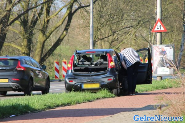 De achterruit sneuvelde door het ongeval, waardoor het glas over de rijbaan lag verspreid.