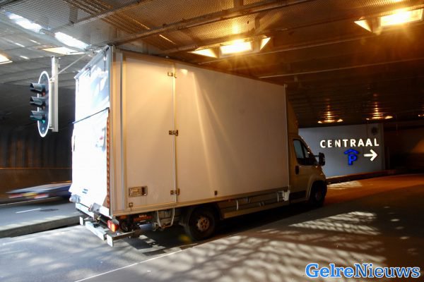 ARNHEM – In de ingang aan de Willemstunnel van de parkeergarage centraal Arnhem stond maandagochtend een bestelbus vast onder het plafond.